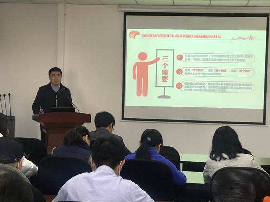 陈光副教授以《百年奋斗 百年辉煌》为题,从十九届六中全会会议概况、为何要总结党的百年奋斗的重大成就和历史经验、中国共产党百年奋斗的辉煌历史、中国共产党百年奋斗的历史意义和经验启示等四个方面全面阐述了党的十九届六中全会精神;并结合自身的研究,对《中共中央关于党的百年奋斗重大成就和历史经验的决议》进行了深入解读。